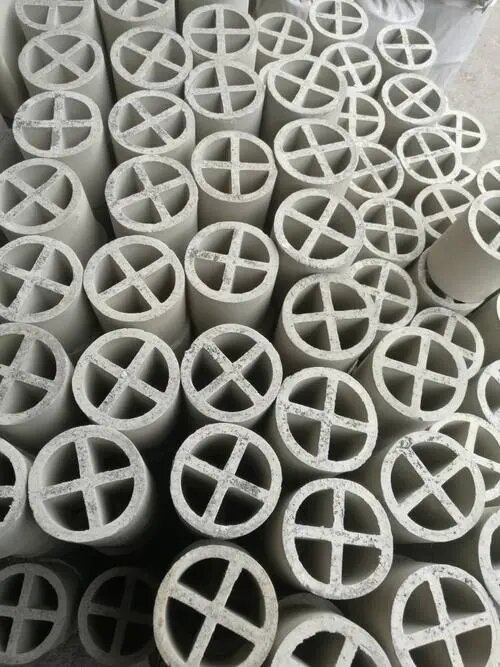 陶瓷十字环,也叫陶瓷十字隔板环填料,顾名思义,其形状呈现出十字结构,是一种特殊的陶瓷填料。是基于增加填料的比表面积,从而强化传质效率而开发出来的。陶瓷十字环填料是在拉西环中间增设了十字隔板。一般来讲,这种填料由于尺寸较大,仅适用于整体堆砌,目前一般只作为散堆填料的塔底支撑分布层用。 80 -150mm 规格可作支承材料,空隙率大于 60% ,个数为整聚数。它结合了陶瓷材料的优良特性,如耐高温、耐腐蚀和高强度,使得其在化工、石化、环保等领域中的塔式设备中得到广泛应用。十字环填料的设计目的同样是为了增加填料的比表面积,提高气液传质效率。