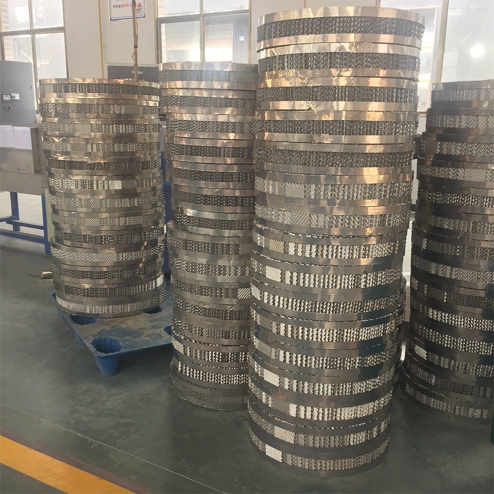 相邻两波纹片流道成90度,上下两盘波纹填料旋转90度叠放,在直径较小用法兰连接的塔内,波纹填料做成一个个整的圆盘,直径略小于塔的内径。在直径较大的塔内,每盘波纹填料分成数块,通过人孔放入塔内,在塔内拉拼成一个个完整的圆盘,上下两盘填料的波纹片旋转90度安装,使流体在塔内充分混合。