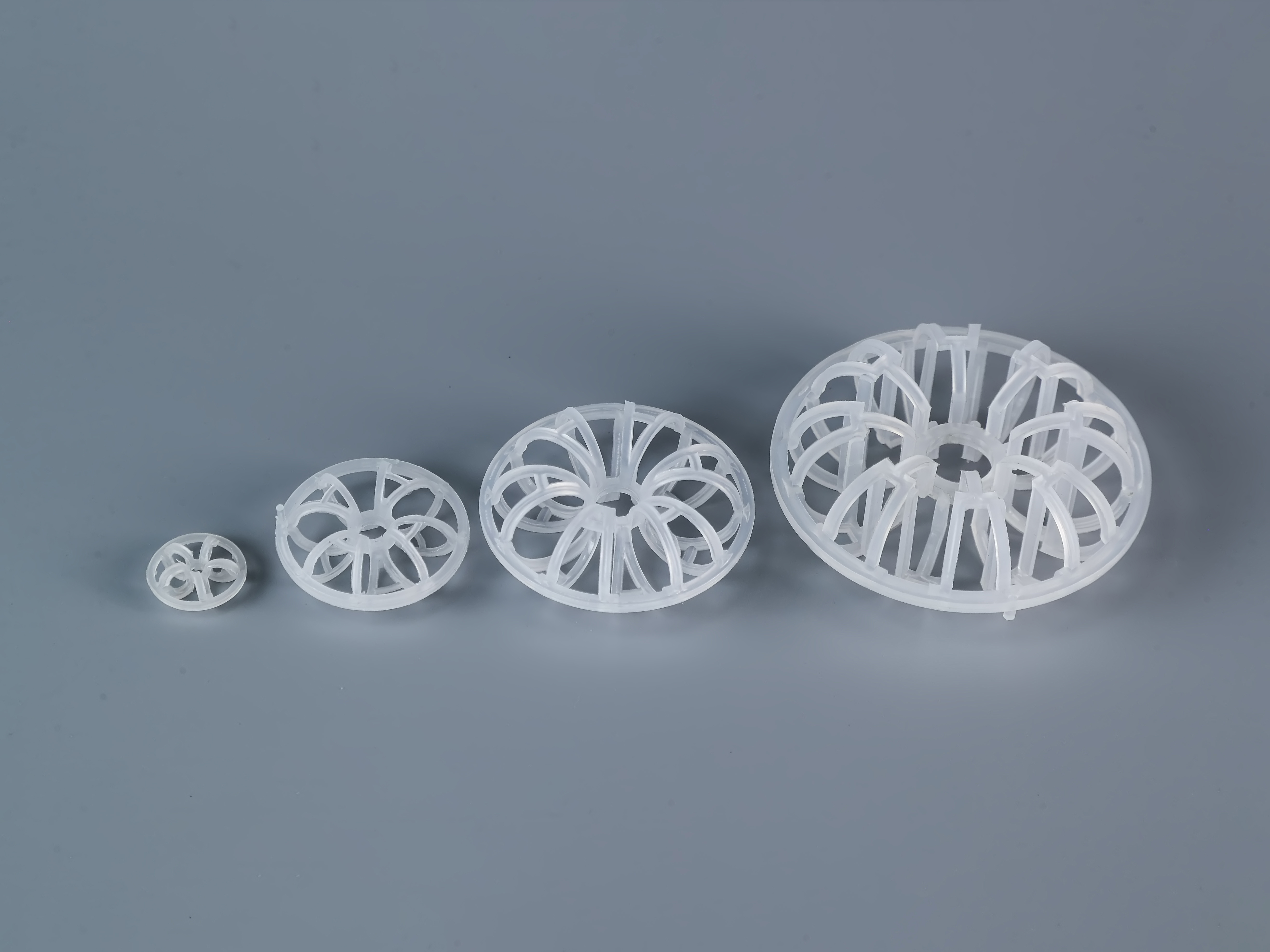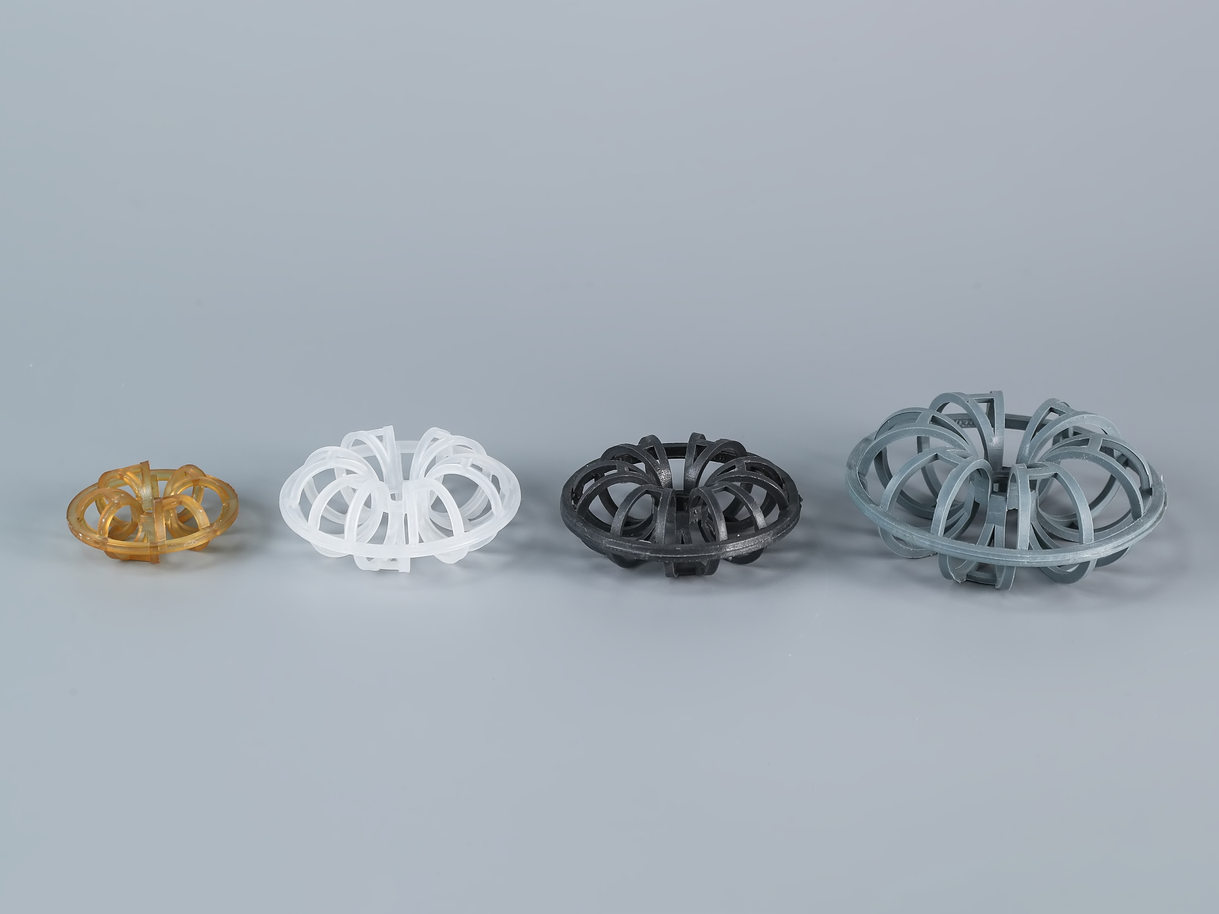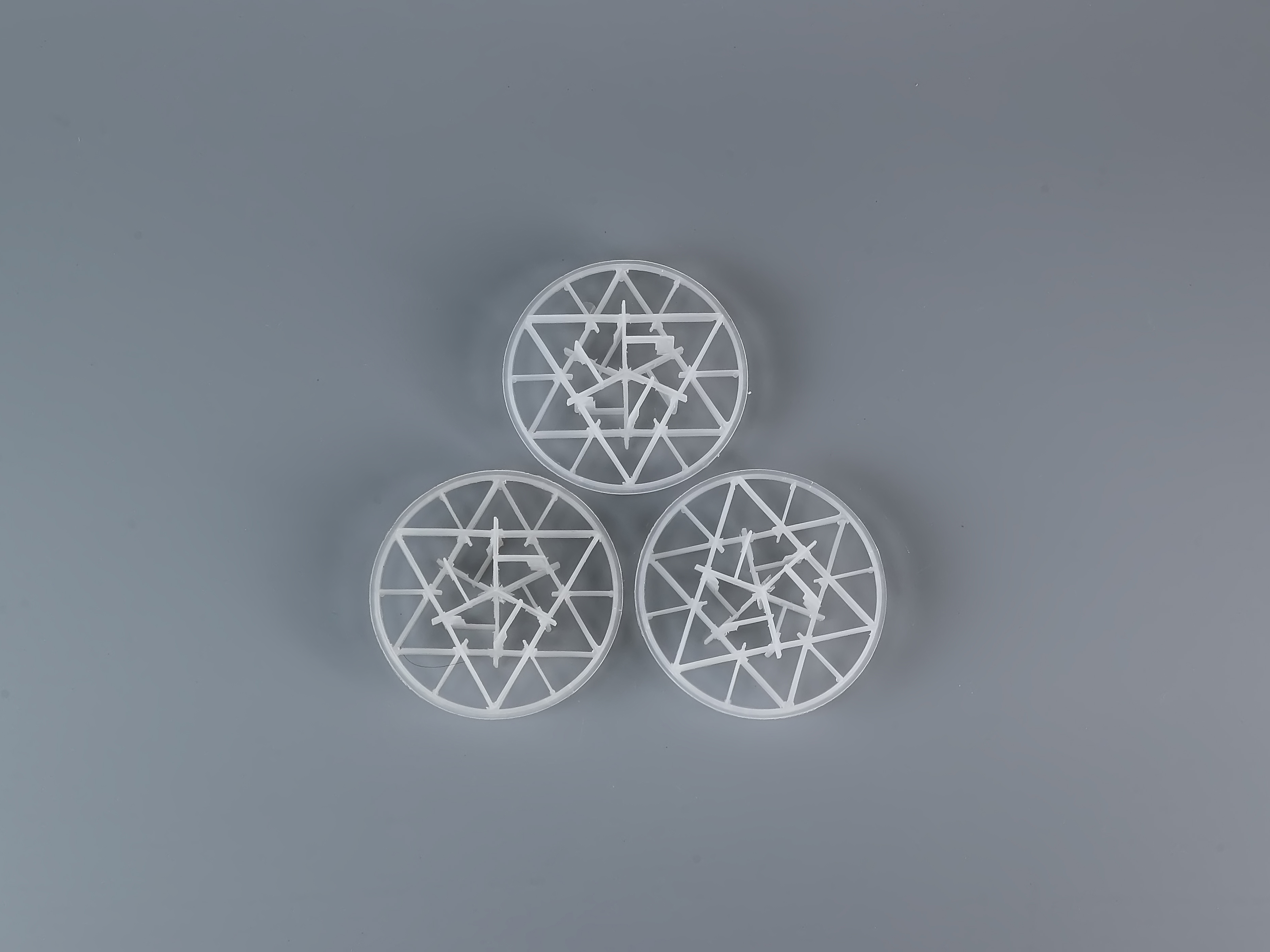 塑料泰勒花环填料的外型设计是由12个小圆环按径向排列而组成的一个大扁球体。由许多圆环绕结而成中间设置一个加强筋使之呈现”A”形状这样提高了花环填料的抗压强度,由于塑料花环填料的结构特点,不但使液体可以在填料层中均匀分布,它的结构特点也使填料的压降小了很多,填料的空隙处能有较高的持液量,这样结构的填料增加了空隙,空隙处能有较高的持液量,可使塔内液体的停留时间较长,从而增加了气液两相的接触时间,提高了填料的传质效率。