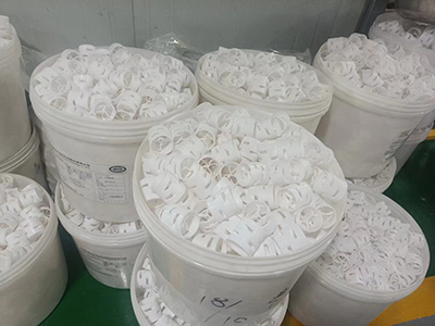 其核心优势源于聚四氟乙烯材质特性,可耐受-200℃至260℃的极端温度范围,在强酸(如硫酸、硝酸)、强碱(如氢氧化钠)及各类有机溶剂(如乙醇、丙酮)环境中不发生化学分解,解决了传统金属或陶瓷填料易腐蚀、寿命短的问题。同时,鲍尔环特有的环形结构与上下两层窗孔设计,打破了填料间的气流死区,使气液两相能更充分接触,相比同规格拉西环,传质效率提升30%以上,压降低20%-25%,适用于高粘度、易结垢的介质处理场景。
